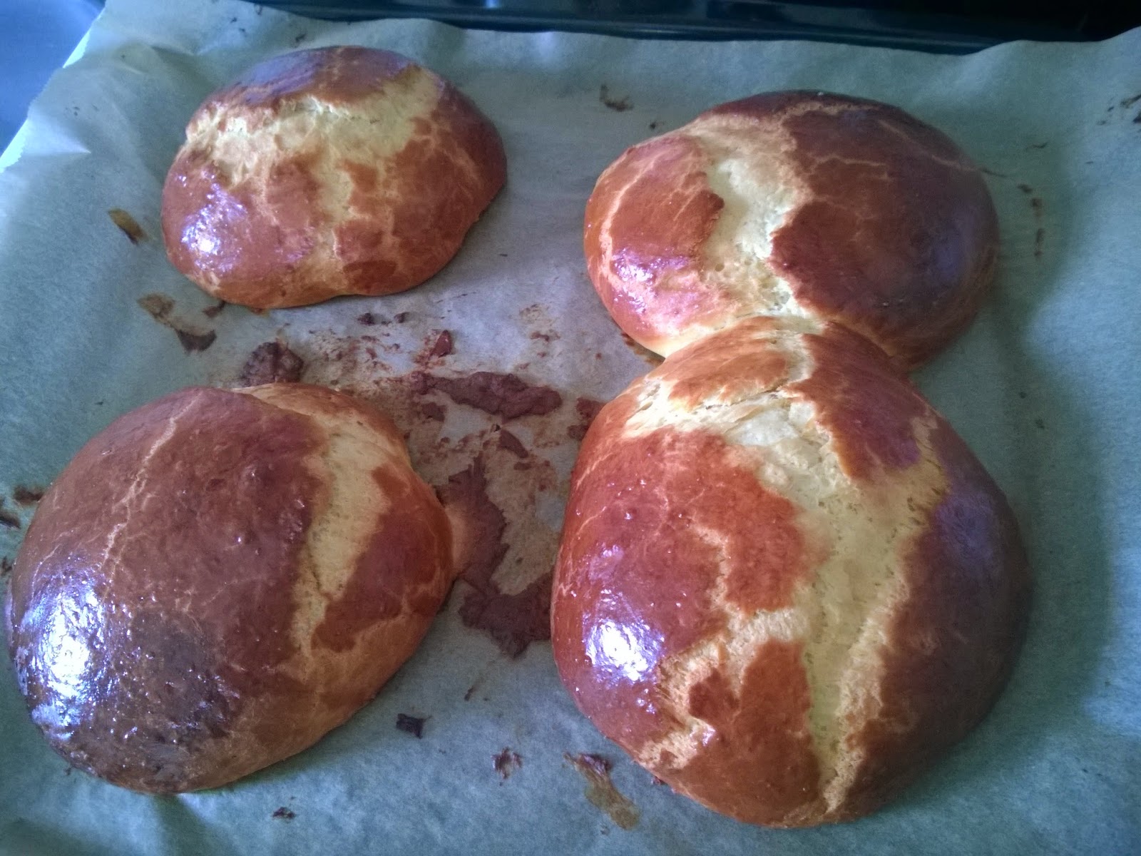 Briossisämpylöiden tekeminen oli varsin aikaavievää. Onneksi aloitin edellisenä päivänä. Kohotusjaksot oli helppo ajoittaa tapahtuvaksi ensin yön aikana ja sitten aamupäivällä, jolloin sitten iltapäivällä sämpylät olivat valmiita sopivasti grillin lämmityksen aikaan. Tein puolikkaan taikinan ja leivoin siitä neljä sämpylää. Tämä oli liioittelua, sämpylöitä olisi pitänyt leipoa kuusi, sillä nuo neljä olivat aivan tolkuttoman kokoisia. Kuten ylimpänä näkyvästä kuvasta näkee, hukkuivat burgerin täytteet totaalisesti sämpylän sisälle. Päivittänen muutenkin kelvollisemmat kuvat seuraavan leivonnan yhteydessä.